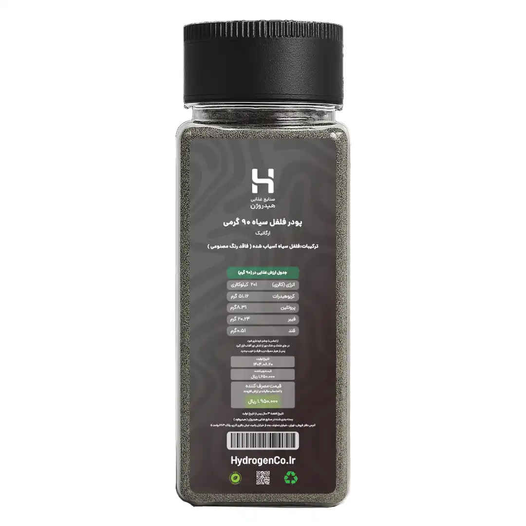 پودر فلفل سیاه ارگانیک هیدروژن، بستهبندی ۹۰ گرمی